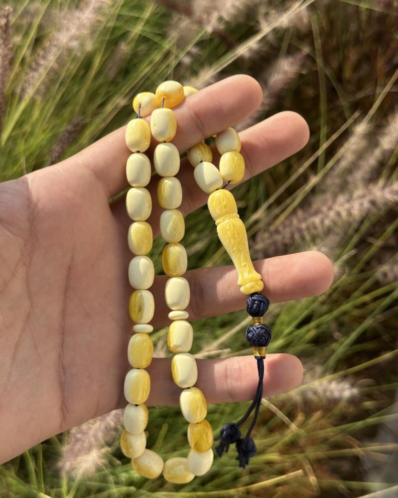 مسباح تراب كهرمان يتميز برائحته الفواحه الليمونيه قصة برميلي منفوخ قمة الفخامة والأناقة مسباح مميز للاستخدام اليومي مع الكركوشة ذات التفصال اليدوي.